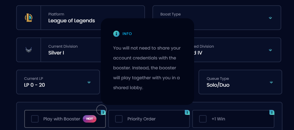 However, if you select the "play with duo" option when in the Eloking checkout screen, you'll find that you won't be asked to give your credentials. This is because, instead of the booster posing as you, they'll be playing WITH you instead. This'll make it seem like you just so happened to have a super skilled and talented friend on your team.